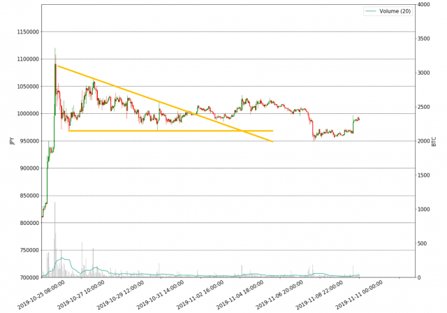 一方、LTC、BNB(バイナンスコイン)、EOS(イオス)、BSV(ビットコインSV)等の時価総額上位のアルトコインは対ドルで急落前の水準まで戻しており、先週のアルトコインを中心としたリスク選好ムードは健在と言えよう。BTCの対円も、一目均衡表の基準線(96万円)や10月23日安値(80万円)と同月27日高値(112万円)を起点とするフィボナッチ・リトレースメント50%押し(96万円)で下げ止まっており、今朝方には一時99.6万円まで反発した。先週の下げがSWELLを意識したXRP売りが原因ならば、BTCの売りも一巡し上値も幾分軽くなったと指摘される。