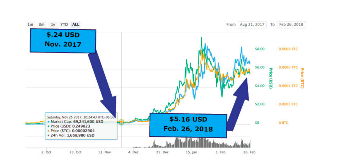 cryptocurrency VENは、実際には、過去3ヶ月間に神のような力を示しています.2018年2月26日現在、11月の0.24ドルから2018年5.16ドルへの動きは500%を超えています。この成長率は、VeChainを、この期間における評価のためにクリプトクロスの上位5%に位置付けます。これは、この時間枠のために、EthereumとBitcoinが混乱する天文学的な感謝です。