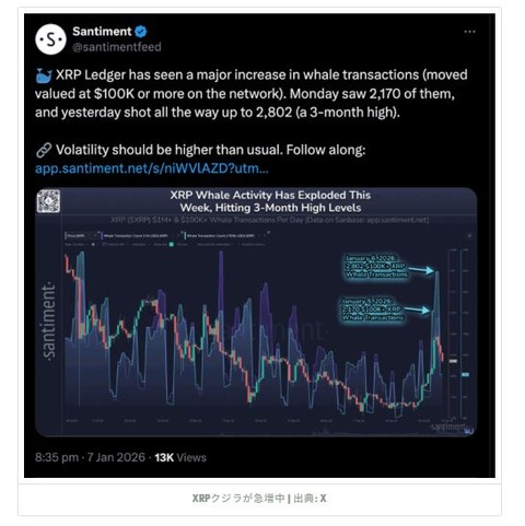ブロックチェーン分析会社サンティメントは、XRP 元帳では、「クジラ」取引(10 万ドル以上の送金と定義)の急増が記録されました。