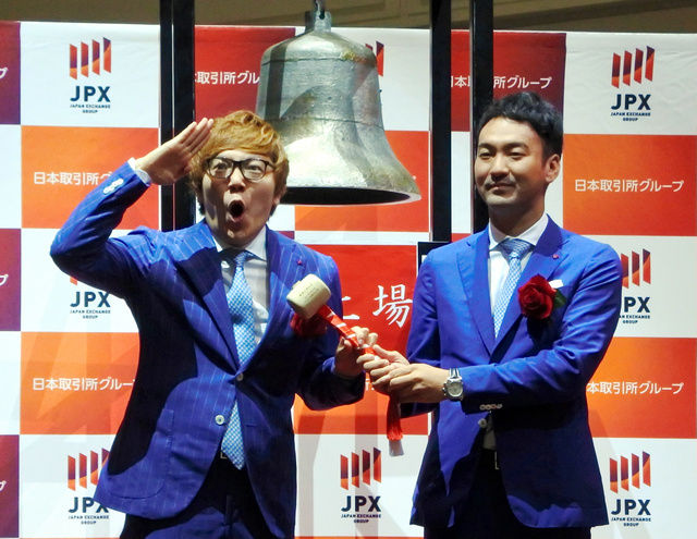 UUUMの東証マザーズ上場記念式典に登場した人気ユーチューバーのヒカキンさん(右)=東京都中央区の東京証券取引所動画共有サイト「ユーチューブ」に投稿する「ユーチューバー」のマネジメント支援会社「UUUM(ウーム)」が30日、東京証券取引所マザーズに新規上場した。